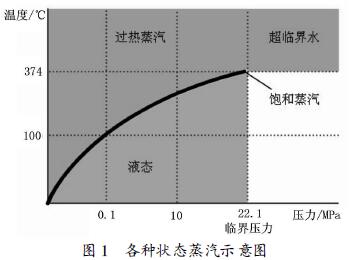 蒸汽是吸收潛熱后帶有一定壓力的水。蒸汽按狀態(tài)可分為飽和蒸汽和過熱蒸汽。由鍋爐產(chǎn)生的水蒸氣為飽和蒸汽,飽和蒸汽加熱得到過熱蒸汽。圖1說明了各種狀態(tài)蒸汽在不同溫度及壓力下的轉(zhuǎn)換關(guān)系。