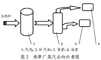 熱帶廠目前使用的蒸汽主要由加熱爐爐內(nèi)管道汽化產(chǎn)生,蒸汽過渡儲(chǔ)存在汽包中。設(shè)計(jì)要求汽包工作壓力為0.50~0.80MPa,正常工作壓力為0.70MPa左右。汽包產(chǎn)生的蒸汽流量為3.0t/h。蒸汽通過DN100的管道輸送,蒸汽終端用戶為食堂和浴室,蒸汽主要用于加熱。圖2對(duì)熱帶廠的蒸汽去向作了簡(jiǎn)單的說明。