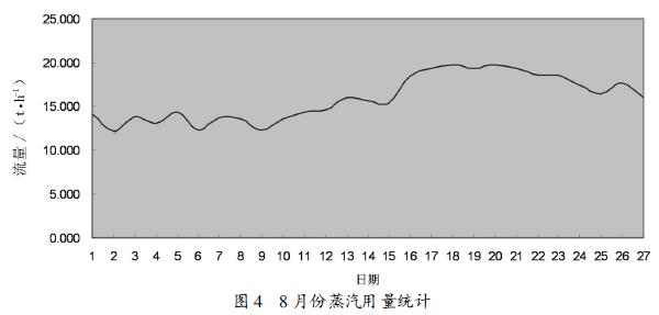 抗振型渦街蒸汽流量計(jì)使用一個(gè)月,對(duì)數(shù)據(jù)進(jìn)行收集和統(tǒng)計(jì),得到每天蒸汽用量(參見圖4)。