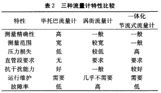 根據(jù)三種流量計的特點,從測量精確度、測量范圍、壓力損失、抗干擾能力及運行維護等方面進行比較,如表2所示。
