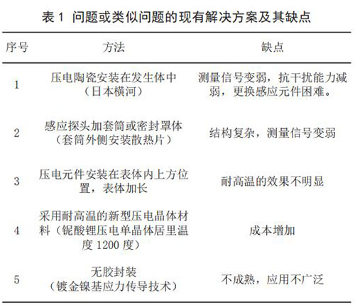 3) 當前技術系統(tǒng)存在的問題。 由于目前使用的傳感器檢測感應元件為壓電陶瓷,其*化時居里溫度大約420 ~ 460℃,因此只能在低于 240℃介質(zhì)中使用,一旦被測量介質(zhì)的溫度高于 240℃,煤氣流量表傳感器便會因壓電陶瓷達到居里點,絕緣電阻降低,壓電信號變?nèi)醵А?br /> 4)問題或類似問題的現(xiàn)有解決方案及其缺點(見表 1)。