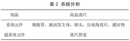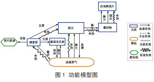建立已有系統(tǒng)的功能模型(見圖 1)。通過功能模型分析,描述了系統(tǒng)元件及其之間的相互關系,并得出導致傳感器耐受溫度不足問題的功能因素:高溫蒸氣對測量管傳熱;測量管對探頭傳熱;探頭對灌封物傳熱;灌封物對壓電陶瓷片傳熱;高溫蒸氣對探頭傳熱。
