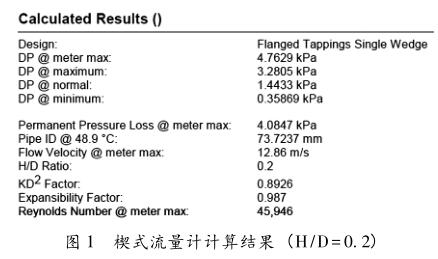 (4)根據(jù)工藝要求及現(xiàn)場(chǎng)安裝環(huán)境選擇耐壓、耐溫等級(jí)、防護(hù)等級(jí)、防爆等級(jí)、輸出信號(hào)等。3測(cè)量熱解氣的渦街流量計(jì)的選型設(shè)計(jì)熱解氣的組分如表1所述,其工藝參數(shù):操作密度0.63kg/m3,運(yùn)動(dòng)粘度2×10-5m2/s,操作溫度48.9℃,操作壓力7.5kPa,管道DN80,*小流量50Nm3/h,正常流量100Nm3/h,*大流量150Nm3/h,儀表測(cè)量范圍選擇0~180Nm3/h。因?yàn)楸狙b置為試驗(yàn)裝置,在裝置運(yùn)行的過(guò)程中,業(yè)主可能會(huì)根據(jù)需要適當(dāng)調(diào)整參數(shù),因此選擇量程比寬一些的流量計(jì)會(huì)有助于調(diào)整后的測(cè)量;另外熱解氣作為產(chǎn)品之一,其流量是驗(yàn)證工藝與關(guān)鍵設(shè)備的工程可行性、優(yōu)化工藝參數(shù)的關(guān)鍵參數(shù)之一,因此使用精度高一些的流量計(jì)也是有必要的;熱解氣的組分隨著參數(shù)的調(diào)整也可能會(huì)發(fā)生變化,因此基于伯努利方程原理的,如孔板、噴嘴、阿牛巴、德?tīng)査汀⑵胶馐降榷疾荒芎芎玫臏y(cè)量,因?yàn)檫@類(lèi)流量計(jì)受流體物性(密度、粘度)和組分變化影響,且*終的熱解氣產(chǎn)品或多或少都有焦油的存在,時(shí)間長(zhǎng)了可能堵塞流量計(jì)。楔式流量計(jì)帶自清潔的功能,如果采用法蘭取壓,變送器采用隔膜密封式變送器,其受焦油的影響較小,楔式流量計(jì)的計(jì)算結(jié)果分別見(jiàn)圖1和圖2。
