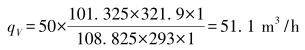 式中,qV、qn分別為工作狀態(tài)和標(biāo)準(zhǔn)狀態(tài)下的體積流量,m3/h;P、Pn分別為工作狀態(tài)和標(biāo)準(zhǔn)狀態(tài)下的絕對(duì)壓力,Pa;T、Tn分別為工作狀態(tài)和標(biāo)準(zhǔn)狀態(tài)下的熱力學(xué)溫度,K。