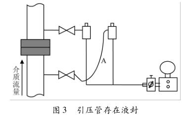 在用孔板測量蒸汽流量時(shí),通常要安裝2個(gè)冷凝罐,2個(gè)冷凝罐內(nèi)液位高度相等是差壓信號(hào)不失真?zhèn)鬟f的關(guān)鍵。這2個(gè)冷凝罐必須同高度安裝,底部是出口接變送器,冷凝罐的側(cè)面是入口接孔板側(cè),按照圖2取壓。其作用有2個(gè):一是將蒸汽差壓信號(hào)轉(zhuǎn)換成凝結(jié)水的差壓信號(hào),以防蒸汽直接進(jìn)入差壓變送器高低壓室,燙壞儀表;二是保證引壓管兩側(cè)冷凝液位相同,起到平衡作用,冷凝罐截面積相對于引壓管截面來說要大很多,有利于維持冷凝水液位的相對穩(wěn)定。