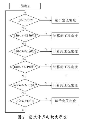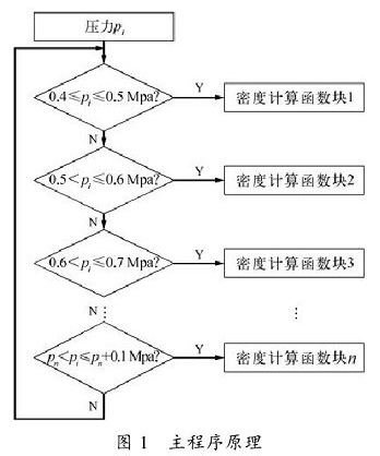 定義密度計算程序是蒸汽壓力0.4~0.5MPa的一個函數(shù),以相同的方法定義0.5~0.6MPa,0.6~0.7MPa,一直到0.9~1MPa等若干個函數(shù),這里不再重復(fù)。通過對壓力值范圍的判斷調(diào)用相應(yīng)的函數(shù),就可以得到較為準(zhǔn)確的密度值。程序框圖如圖1,圖2所示,pi為蒸汽壓力,ti為蒸汽溫度。